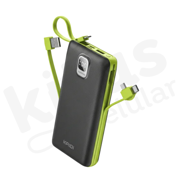 A Bateria Portátil 20.000mAh Kaidi KNC-8882 é um power bank feito para quem precisa de muita carga extra e não quer ficar preso na tomada. Com 20.000mAh, visor de bateria e cabos integrados, ela é perfeita para carregar celular, fones e outros acessórios no dia a dia, no trabalho e em viagens.