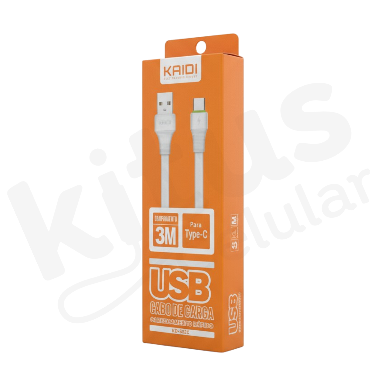O Kaidi KD-332C é um cabo Turbo USB para Tipo C de 3 metros, feito para quem quer carregar rápido e ter liberdade longe da tomada. Ele combina potência de até 2,4 A com transferência de dados estável — ideal para celular, tablet, fones e power banks USB-C.