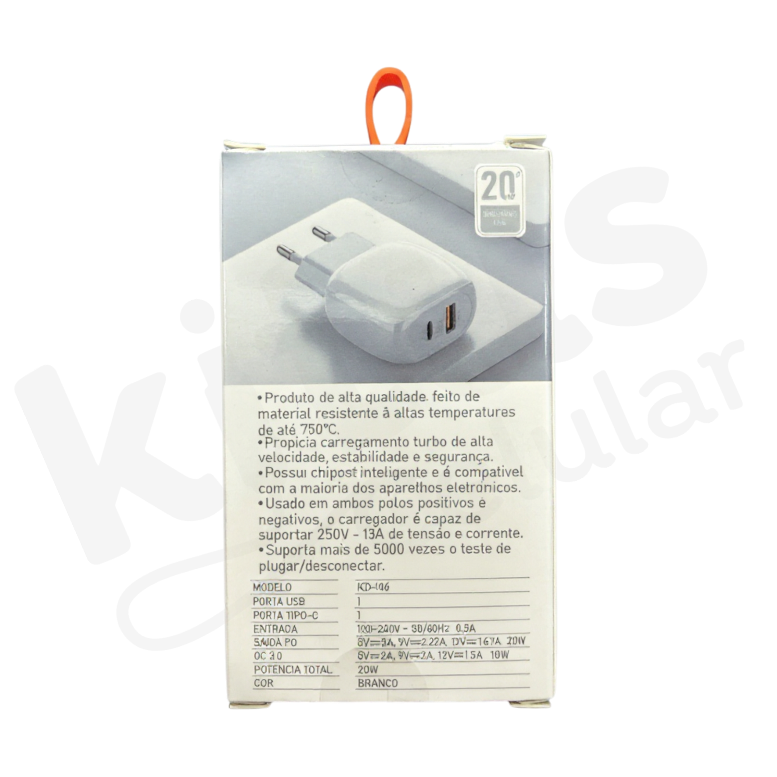 – 1x Fonte/Carregador Kaidi KD-106 20W (USB + USB-C)